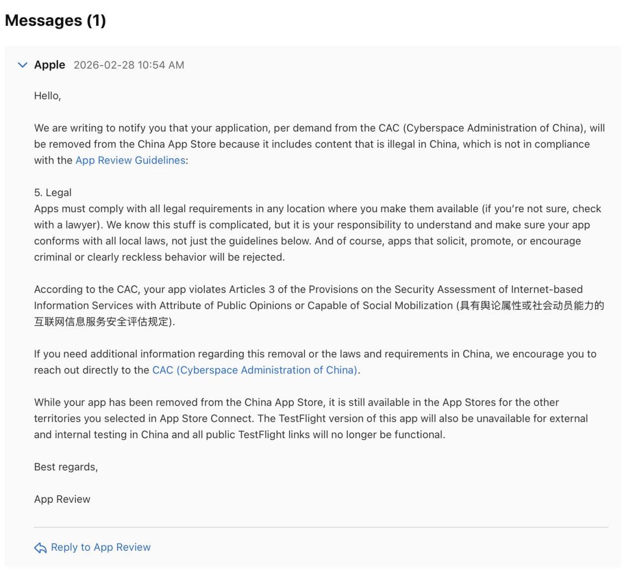 2026 年 4 月 6 日,苹果公司应中国国家互联网信息办公室(网信办)要求,从中国区 App Store 下架了由 Twitter 联合创始人 Jack Dorsey 开发的去中心化通讯应用 Bitchat。Jack Dorsey 已在 X 平台确认该应用被下架,并透露 TestFlight 测试版同样被停止分发。