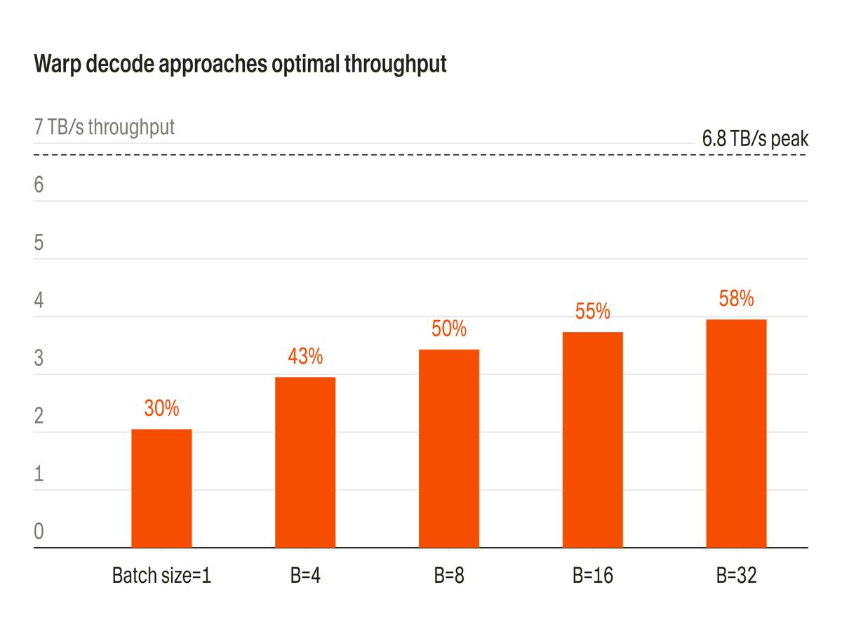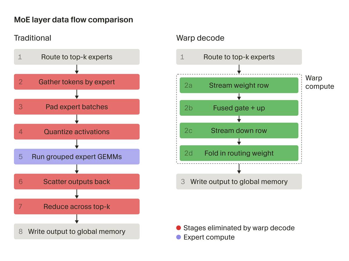 - 去掉填充开销。 传统路径需要把每个专家的 token 列表填充到 2 的幂或 128 字节边界。warp decode 不按专家划分批次,这个问题直接消失。